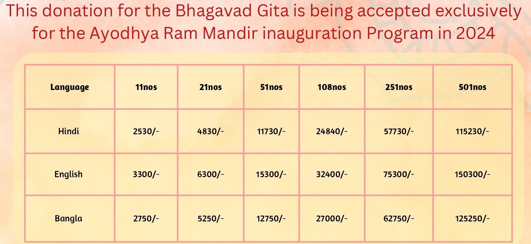 So we are Humbly request for sponsor some quantity of Gita for Ayodhya Ram Mandir as possible asyou can and be a part of this historical movement
