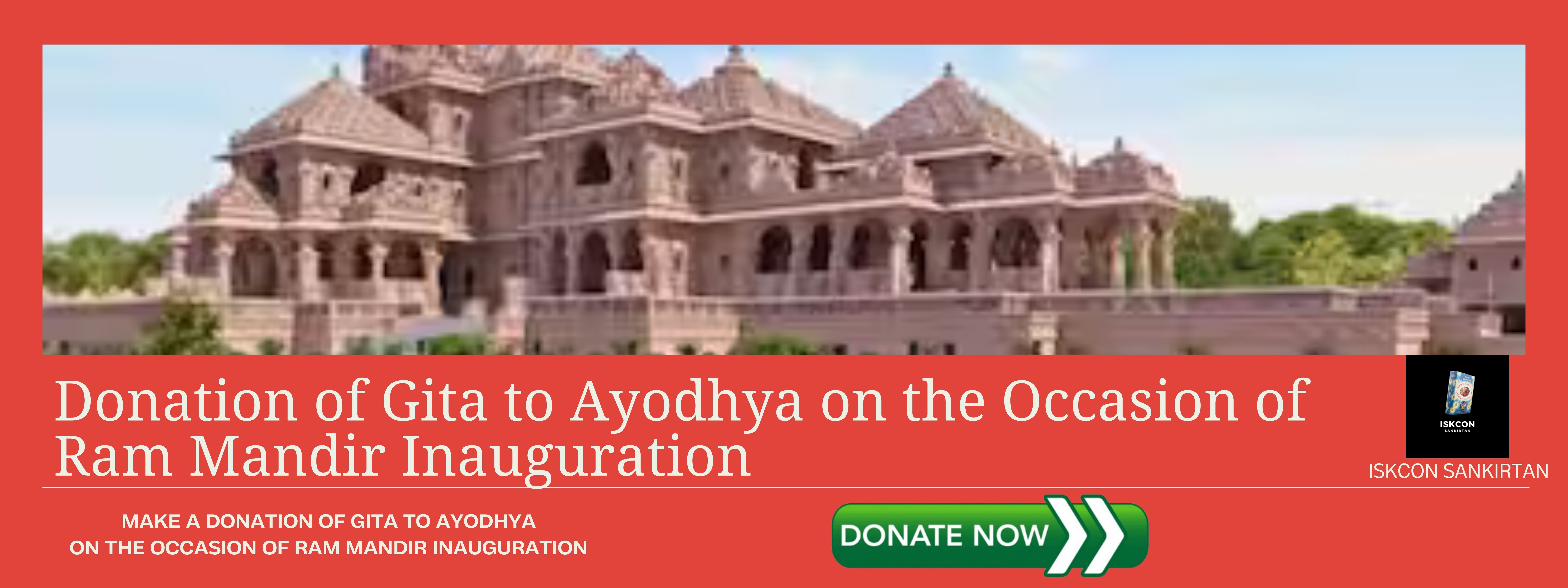 भारत सरकार ने आयोध्या राम मंदिर के उद्घाटन कार्यक्रम में ISKCON मायापुर को शामिल होने के लिए आमंत्रित किया है।हमारी तीन सेवाओं का हिस्सा बनते हुए, हम महाप्रसाद, श्रील प्रभुपाद की पुस्तकें, और हरि नाम संकीर्तन में योजना बना रहे हैं।भक्ति के एक भावनात्मक संकेत के रूप में, हम आयोध्या राम मंदिर उद्घाटन के दौरान 3 लाख भगवद गीता प्रतियां और 5 लाख छोटी पुस्तक प्रतियां, कुल 8 लाख, दान करने का लक्ष्य रखते हैं।